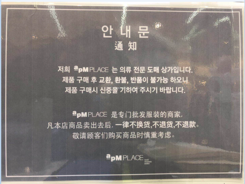 韩国东大门批发市场商品在没有质量问题的情况下是不允许退换的,特殊情况(质量问题,颜色错误,款式错误,尺码错误等)下可以换货,任何情况都不能退货,商品以按订单发货的实物为准,针对商品颜色色差、尺码大小、材质等产生的异议,将不构成换货的理由。