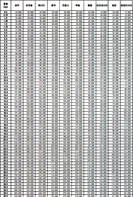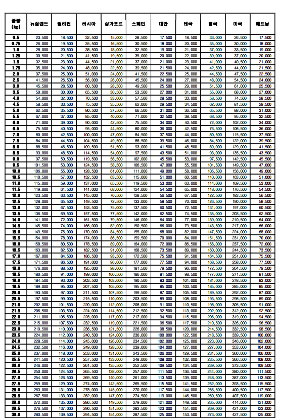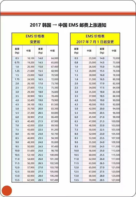 价格 | EMS公示价格如下图 | 价格 | 韩国段运费5000/kg+ 国内运费自理(20-100元左右/箱) |
